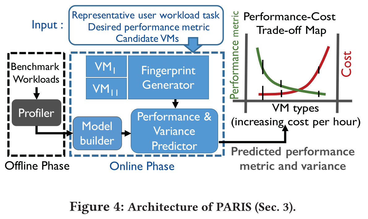 (Section 4) 오프라인 VM 벤치마킹 단계에서 PARIS는 프로파일러를 사용하여 각 VM 유형에 대한 벤치마크 제품군을 실행하고 자세한 시스템 성능 메트릭을 수집한다. 벤치마크 제품군은 다양한 리소스를 사용하고 있고 실제 워크로드 패턴을 이행하는지를 기준으로 선택된다. 이 벤치마킹은 클라우드 공급자가 이미 실행해 뒀거나 제 3자가 올려둔 데이터를 사용할 수 있다. 그러므로 새로운 VM 유형 또는 물리적 하드웨어가 도입되면 새로운 VM 유형에서만 벤치마크를 다시 실행하면 된다. 오프라인 단계는 고정된 일회성 비용만을 소모하며 새로운 사용자 워크로드의 성능 특성을 예측할 때는 다시 실행할 필요가 없다.