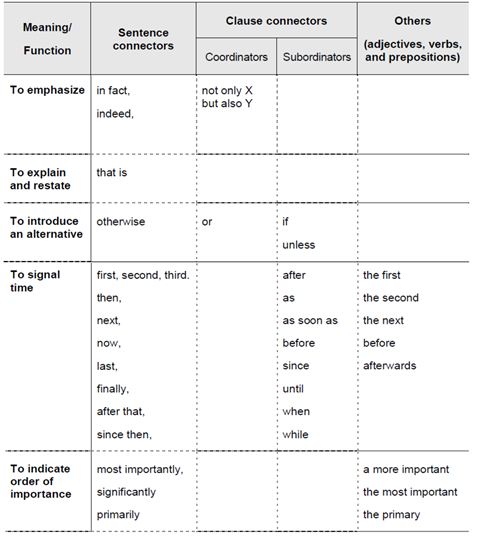 일반적으로 topic/elaboration 문장에 보다 구체적인 아이디어를 도입할 때마다 transition signal을 사용하는 것이 좋다. • "first" 또는 "second"와 같은 단어는 단락의 일부를 소개하는 transition으로 자주 사용된다.