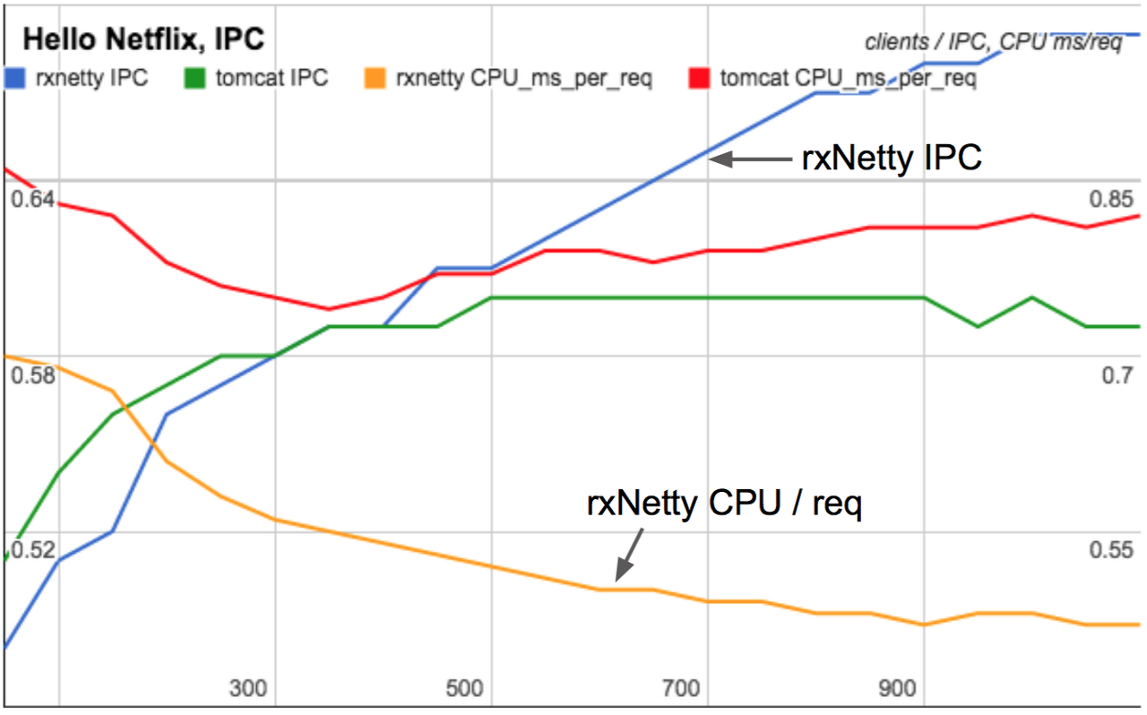 클라이언트가 주는 부하가 증가함에 따라 발생하는 RxNetty와 Tomcat 간의 성능 차이를 이해하는 데는 PMC가 중요하다는 것을 발견했다. Tomcat은 각 연결에 대한 스레드를 사용하여 요청을 처리하는 반면 RxNetty는 event loop thread를 사용한다. Tomcat에서는 request 당 CPU cycle 사용량이 크게 변경되지 않은 반면 RxNetty는 클라이언트가 증가함에 따라 더 효율적으로 동작하며 더 적은 CPU cycle을 소비했다. 클라이언트에서 주는 부하(x축)가 증가함에 따라 rxnetty(주황), tomcat(빨강)선을 각각 보면 CPU에서의 시간(ms)가 점차 줄어드는 것을 확인알 수 있다. 이러한 이유가 짐작이 되는가?