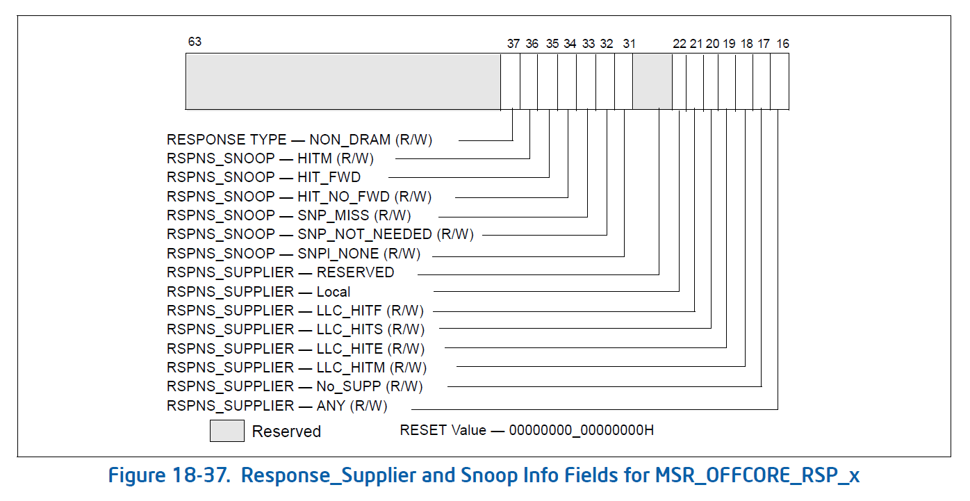 The layout of MSR_OFFCORE_RSP0 and MSR_OFFCORE_RSP1 are shown in Figure 18-18 and Figure 18-19.
