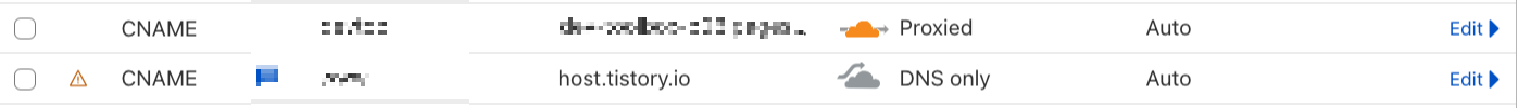 DNS에 Tistory CNAME 등록 (www. 등의 서브도메인이 없는 루트 도메인에 CNAME 레코드를 등록할 수 없는 DNS 서비스가 있어서 A record 사용도 허용되나 IP 변경되면 바꿔주어야 하므로 CNAME 레코드 권장)