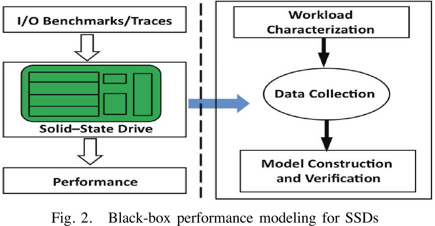 SSD에 대한 성능 모델링의 목표는 워크로드 특성을 통해 주어진 SSD의 성능을 예측하는 데 사용할 수 있는 블랙박스 모델을 구축하는 것이다. 그림 2에 표시된 접근 방식에서 블랙박스 모델은 두 단계로 이루어진다. 1) SSD를 벤치마킹하고 model inputs (workload characteristics) 및 outputs (performance metric)으로 구성된 training data를 수집한다. 2) 통계적 방법을 활용하여 입력과 출력 간의 correlation을 정량화하고 모델을 구성 및 검증한다. 합리적인 것은 성능이 워크로드 특성과 높은 상관 관계를 나타내는 경향이 있다는 것이다. 예를 들어 SSD latency와 throughput은 write request의 비율, random request의 개수, outstanding I/O request가 다를 때 변동(fluctuate)한다.